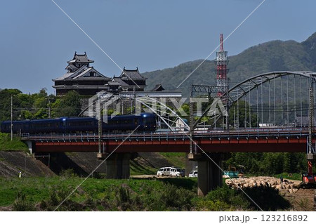 福知山城と鉄橋走る特急はしだて
