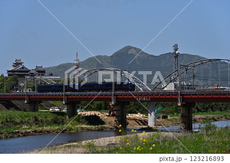 福知山城と鉄橋走る旧あおまつ号