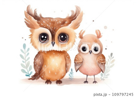Cute watercolor birds, owl and eagle owl in cartoon style, pastel colors. Illustration isolated on a white background. Design elements for print, card, greeting card, scrapbooking.