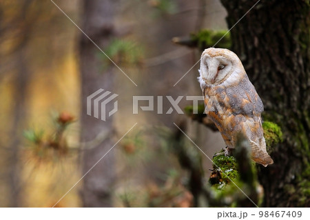 Scops Owl, Otus scops, sitting on tree branch in the autumn forest. Wildlife animal scene from nature. Little bird, owl close-up detail portrait .