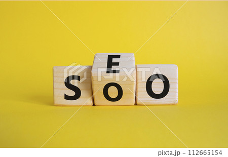 SEO vs SOO symbol. Wooden cubes with words SOO and SEO. Beautiful yellow background. SEO vs SOO and business concept. Copy space
