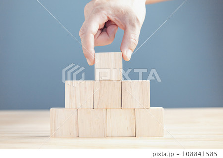 hand of a businessman stacking wood empty eight blocks with copy space for text or symbols, development concept for growth success process.