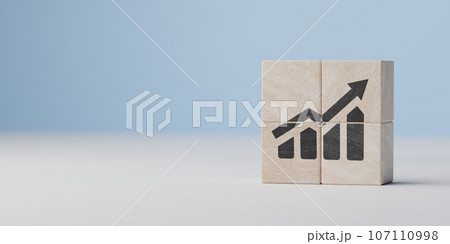 Business success growing growth increase up concept. Business investment growth concept, wooden cube up and increase black arrow on blue background. Sale volume increase make business grow