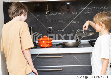 Two young boys cooking together in the kitchen. Child preparing a meal on the stove at home