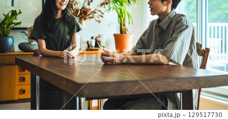 カフェ風リビングで向き合い会話する男女