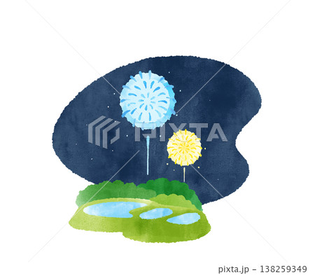 棚田 花火 夏祭り 日本の風景 水彩 かわいい デフォルメ 夜景 田舎 観光 背景