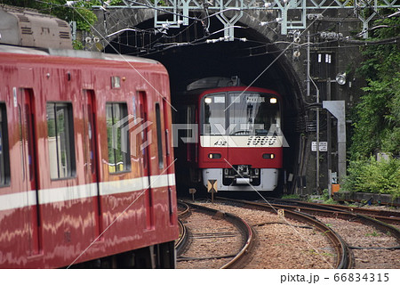 トンネルから出る京急線(すれ違う電車同士)