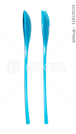 Blue fork and spoon isolated on white background. Blue colour objects. Eating. Salad set fork and spoon. Kitchenwear. Tablewear. Simplicity. Product design. Comfort. Kitchen utensil