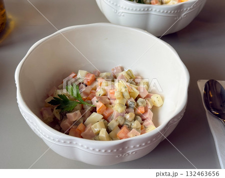 Close-up of Olivier salad with diced vegetables and ham. Homemade cooking, family celebration and comfort through traditional festive food.
