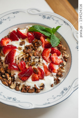 Delicious dessert with fresh strawberries and blueberries on dark surface