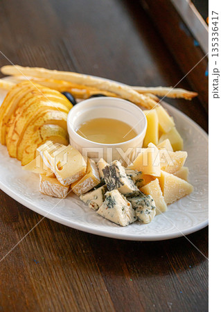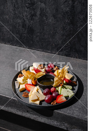 Cheese and fruit platter served on a stylish black plate for a gourmet experience
