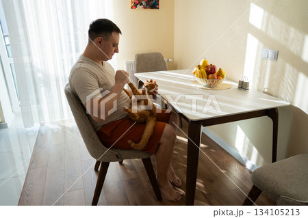 A 35 year old caucasian man plays with his ginger cat while sitting at the kitchen table.