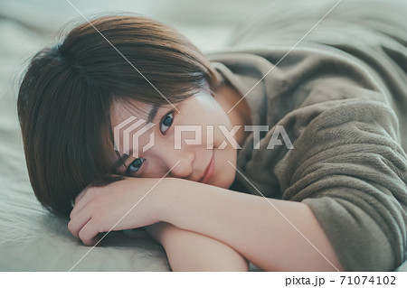 ベッドに寝そべるもこもこパジャマのカメラ目線の女性