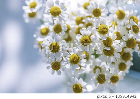 マトリカリアの花束 水色背景にふんわりボケ(縦)