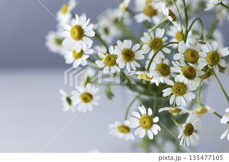 マトリカリアの花束 水色背景にふんわりボケと余白(縦)