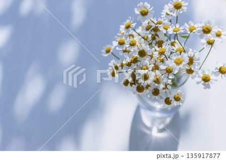 水色背景にマトリカリアの花束 光と影とコピースペース(横長)