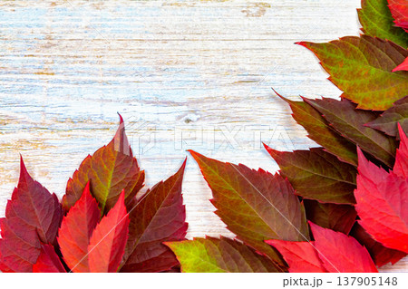 Autumn background. red ivy leaves on a wooden base. place for text.