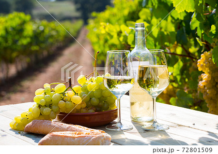 Still life with white wine, grapes and fresh bread in vineyards