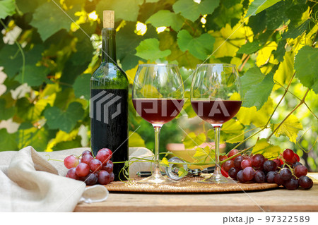 Cold red wine in wine glass and wine bottle with fruits grape trees in morning nature background on wooden table.
