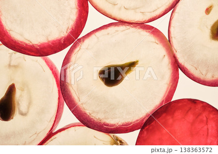 Grape slices with their red skin, translucent pulp, and visible seeds in close-up