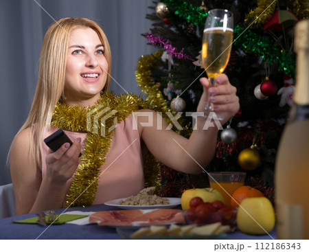 Young female is watching TV and sitting with champagne in New Year night