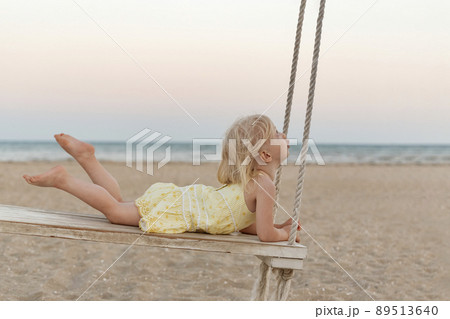 Little caucasian girl rides rope swing on sea background. Cute blonde toddler on the beach at sunset.