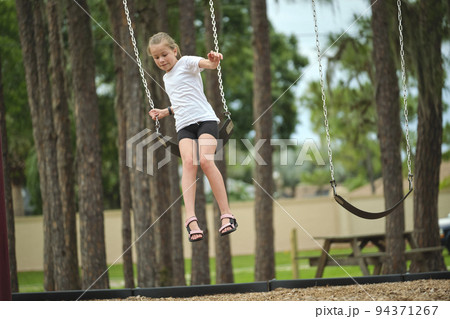 Little Caucasian girl riding swing at playground
