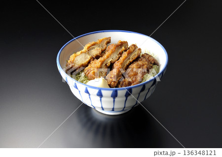 マヨネーズとからあげ丼を黒背景で撮影