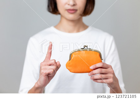 オレンジ色のがま口財布を持って人差し指を立てるミドル女性