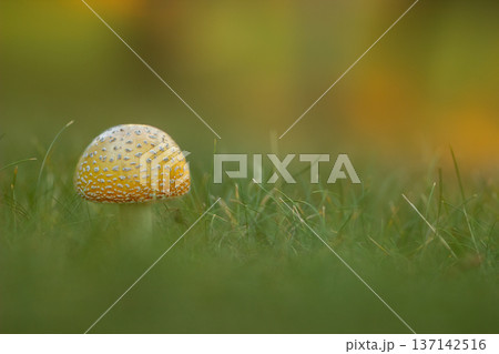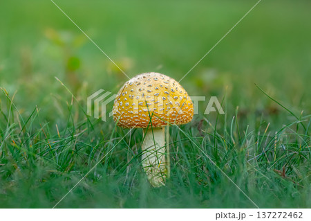 Yellow amanita muscaria mushroom in green fresh grass.