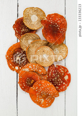 Dried fly agaric on a white background.
