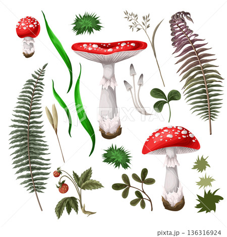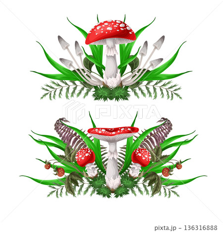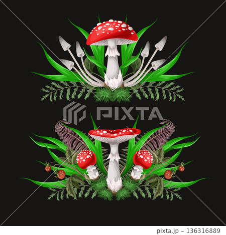 Compositions with Fly agarics, mushroom, and plants isolated. Vector.