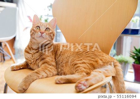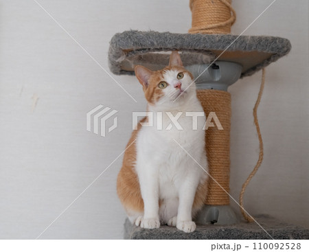 キャットタワーで座る猫 茶トラ白