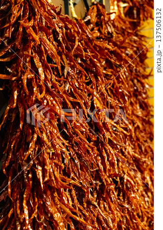 豐收季節:農村曬場中垂掛如簾幕的辣椒瀑布景觀