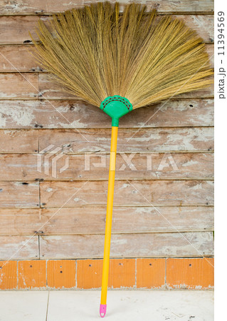 Cleanliness and order at home, a broom of sorghum for sweeping is on the floor against the wall in the kitchen, cleaning equipment, routine household chores