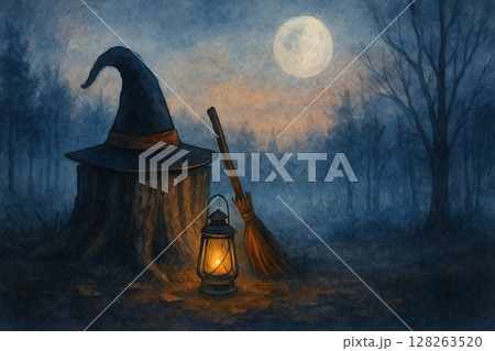 魔女の帽子と月夜の森の情景
