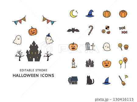線画とカラーを組み合わせた手描き風のハロウィンのイラストのセット