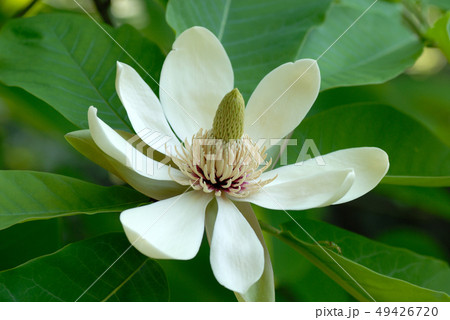 初夏の樹花・雌蕊が赤いホオノキの花・横位置
