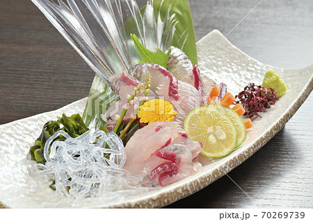 皿に盛られたホウボウの刺身(斜め上から縦長構図)