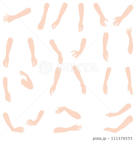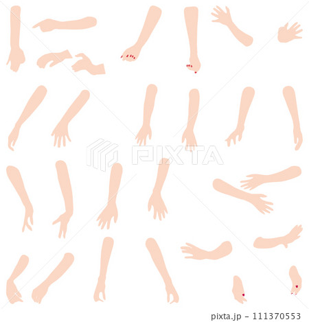 ハンドモデルイラスト集04。さまざまなポージングの女性の指先から肘までのイラストのセット。