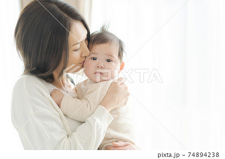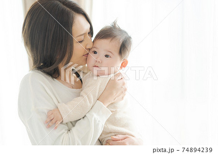 赤ちゃんのほっぺたにキスをする若いお母さん
