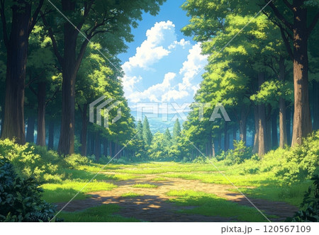 水彩で描いた霧深い森の中の幻想的な風景イラスト