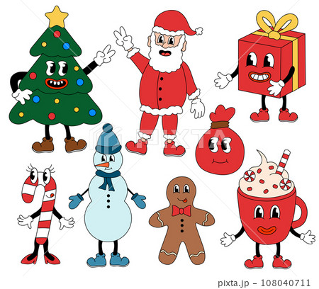 Merry Christmas Groovy Card Set. Christmas tree, Gingerbread Man, Gift Box, Cup in retro cartoon style. Greeting cards, template, posters, prints, party invitations and backgrounds. Vector flat.