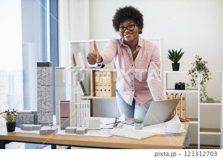Confident African American female architect giving thumbs up in modern office setting with architectural models, showcasing success and creativity in urban design.