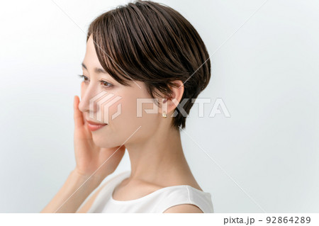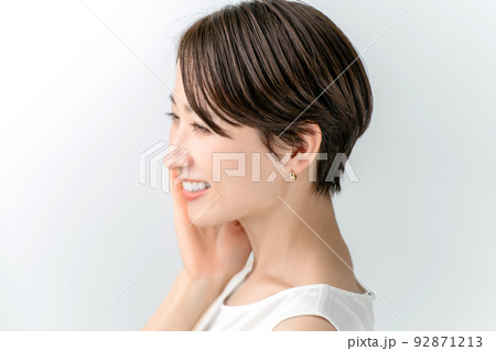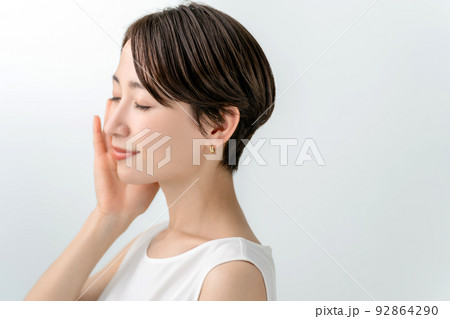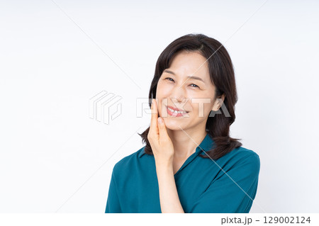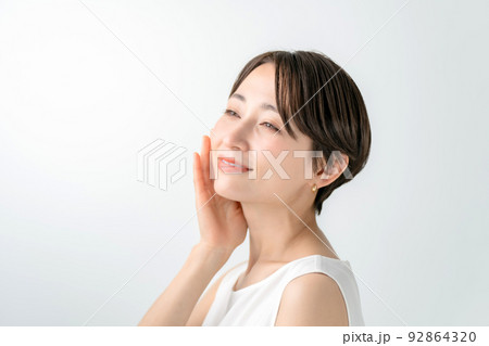 若い女性 感情 笑顔 嬉しい 恥ずかしい ほほに両手をあてる 白バック