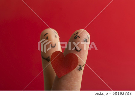 Valentines day fall in love concept. Painted happy funny fingers smiley holding red heart against red background with copy space for ad text