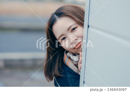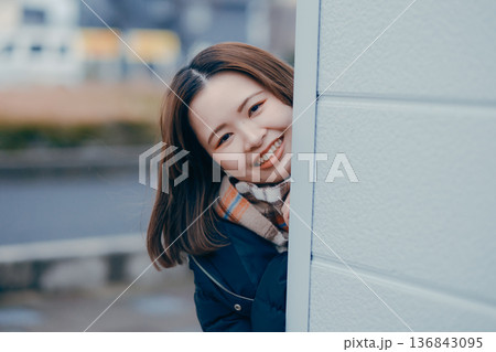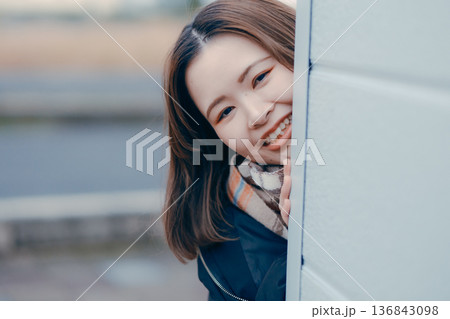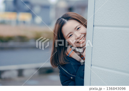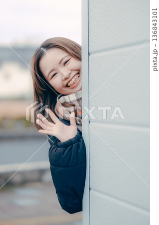 笑顔で手を振る20代日本人女性