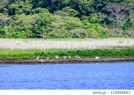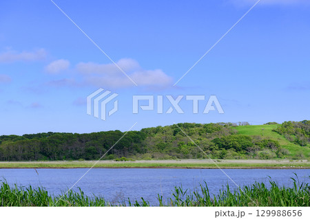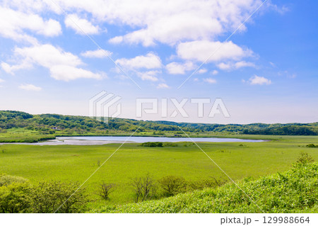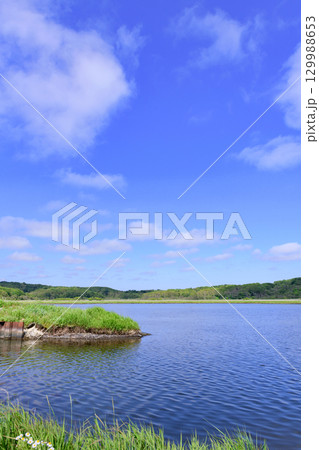 青空の下に広がる浜中町 幌戸湿原の汽水湖「幌戸沼」