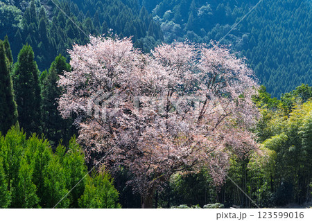 春日和に映える毎床大桜(まいとこおおざくら)樹齢三百年 杉林の中に一本だけ咲いた山桜(人吉・球磨)