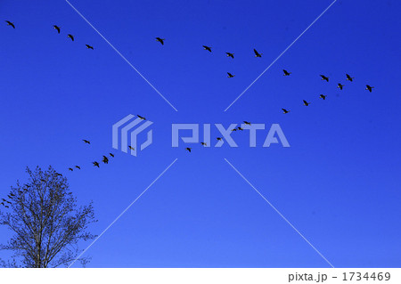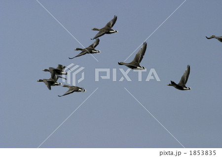 青空背景に編隊を組んで渡りをするマガンの群れ